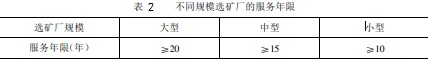 選礦廠的服務(wù)年限按礦山可靠的礦床工業(yè)儲(chǔ)量進(jìn)行計(jì)算。它與選礦廠的規(guī)模有密切的關(guān)系,一般可參照表2確定。