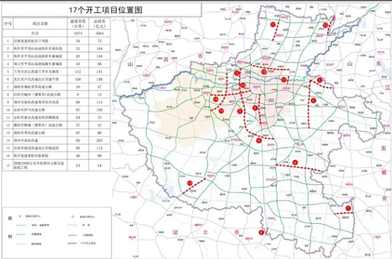 近日,河南省17個交通重點項目分別在鄭州、開封、洛陽等16個省轄市同步宣布開工建設(shè)。開工的17個項目包括16個、共1050公里的高速公路,總投資達1640億元。至此,河南省高速公路建設(shè)項目達到53個,3390公里,總投資高達4556億元。